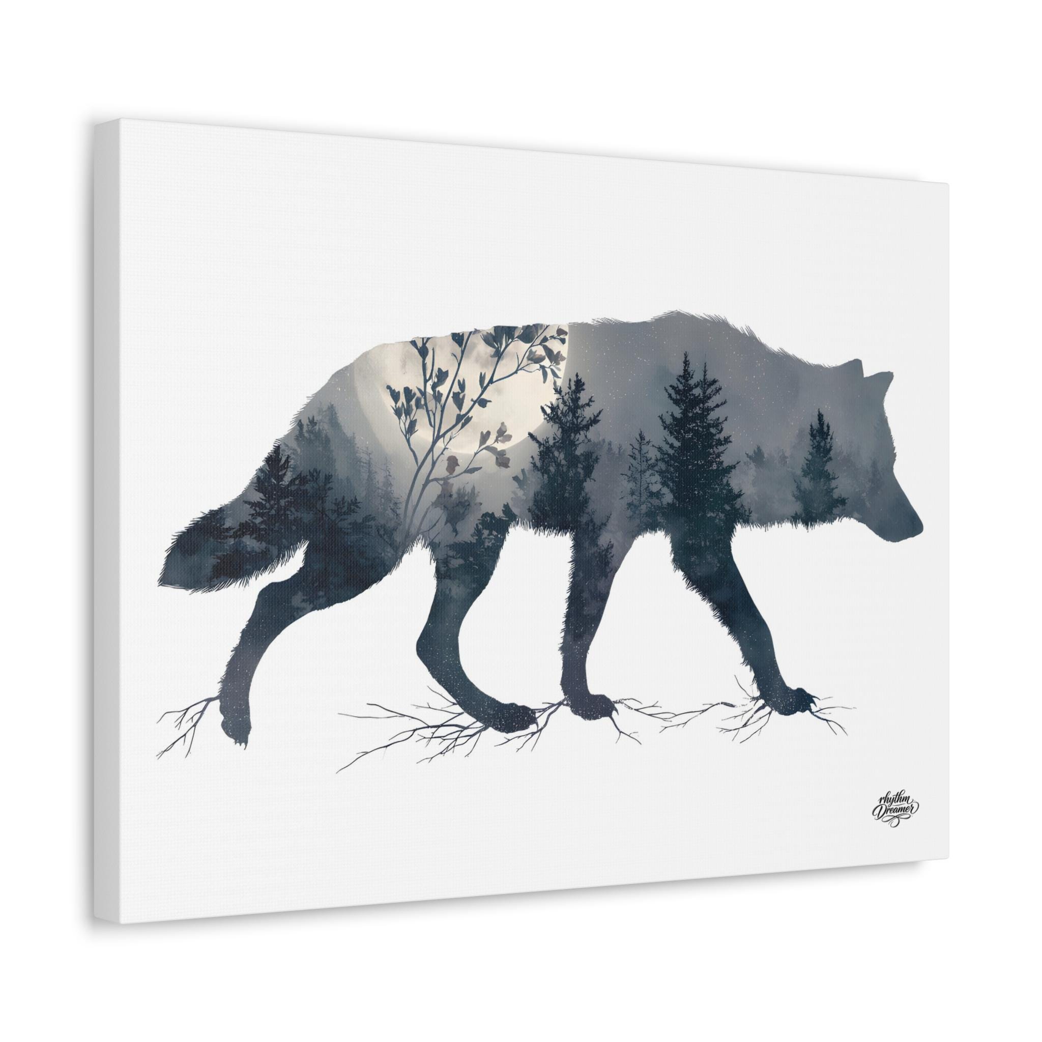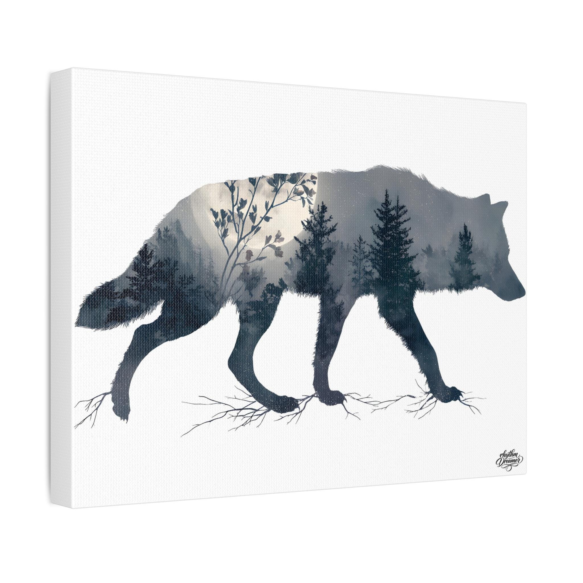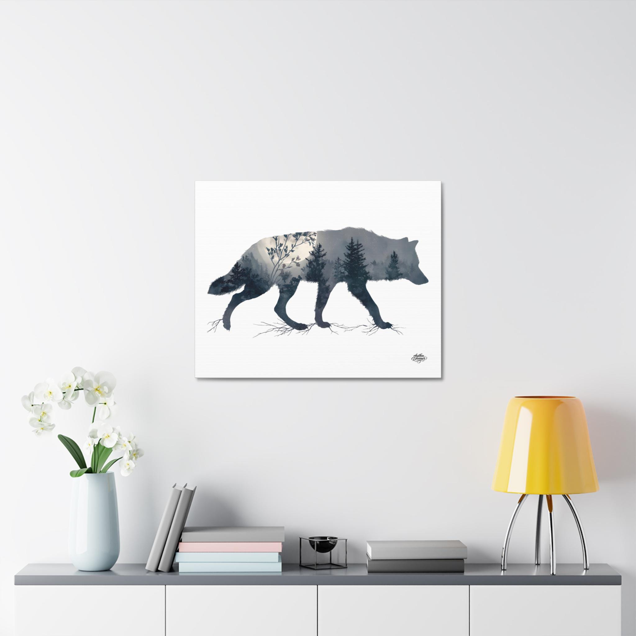 Wolf Silhouette with Misty Forest – Minimalist Nature Canvas Wall Art | Wildlife Wall Decor 30 cm × 40 cm / 45 cm × 61 cm / 61 cm × 76 cm