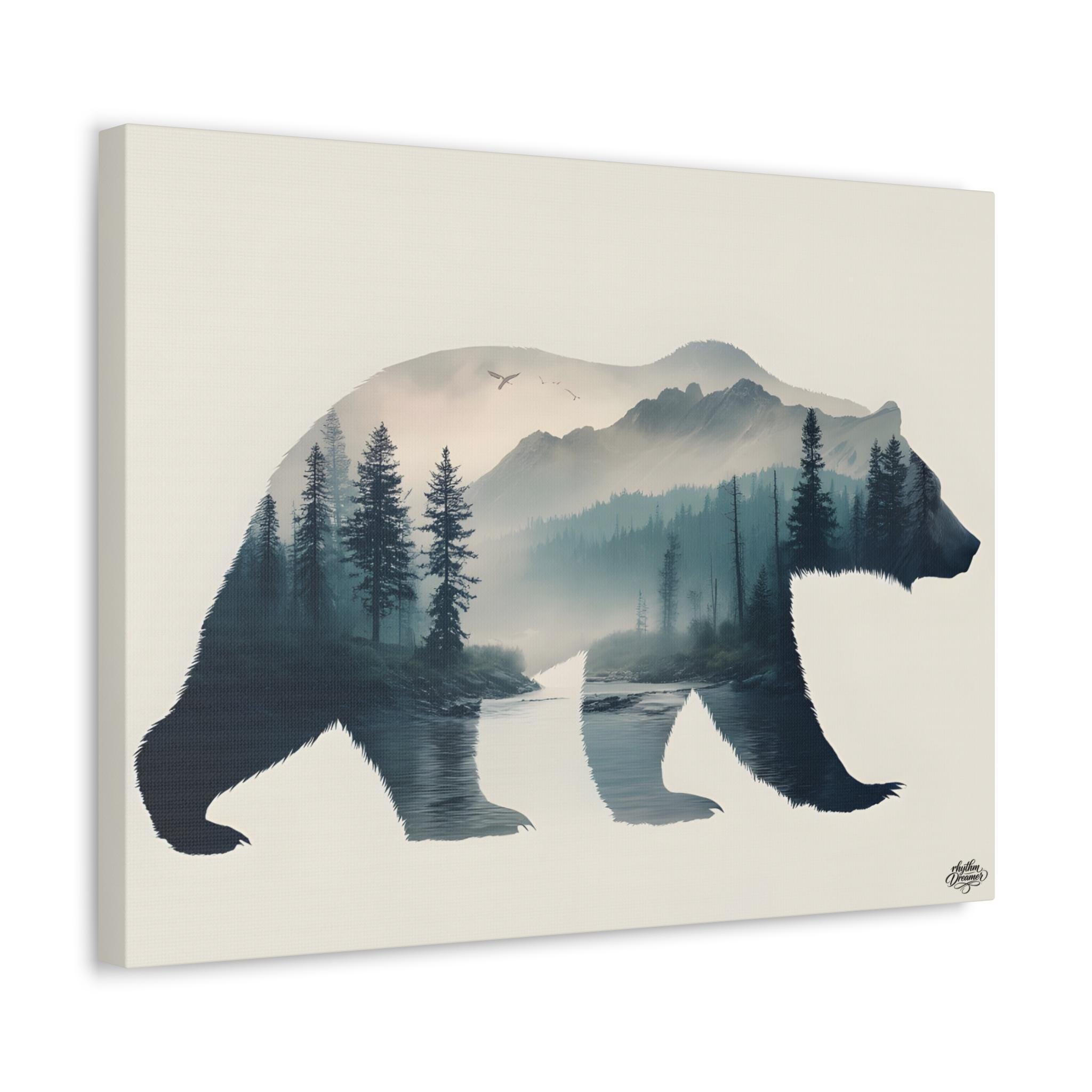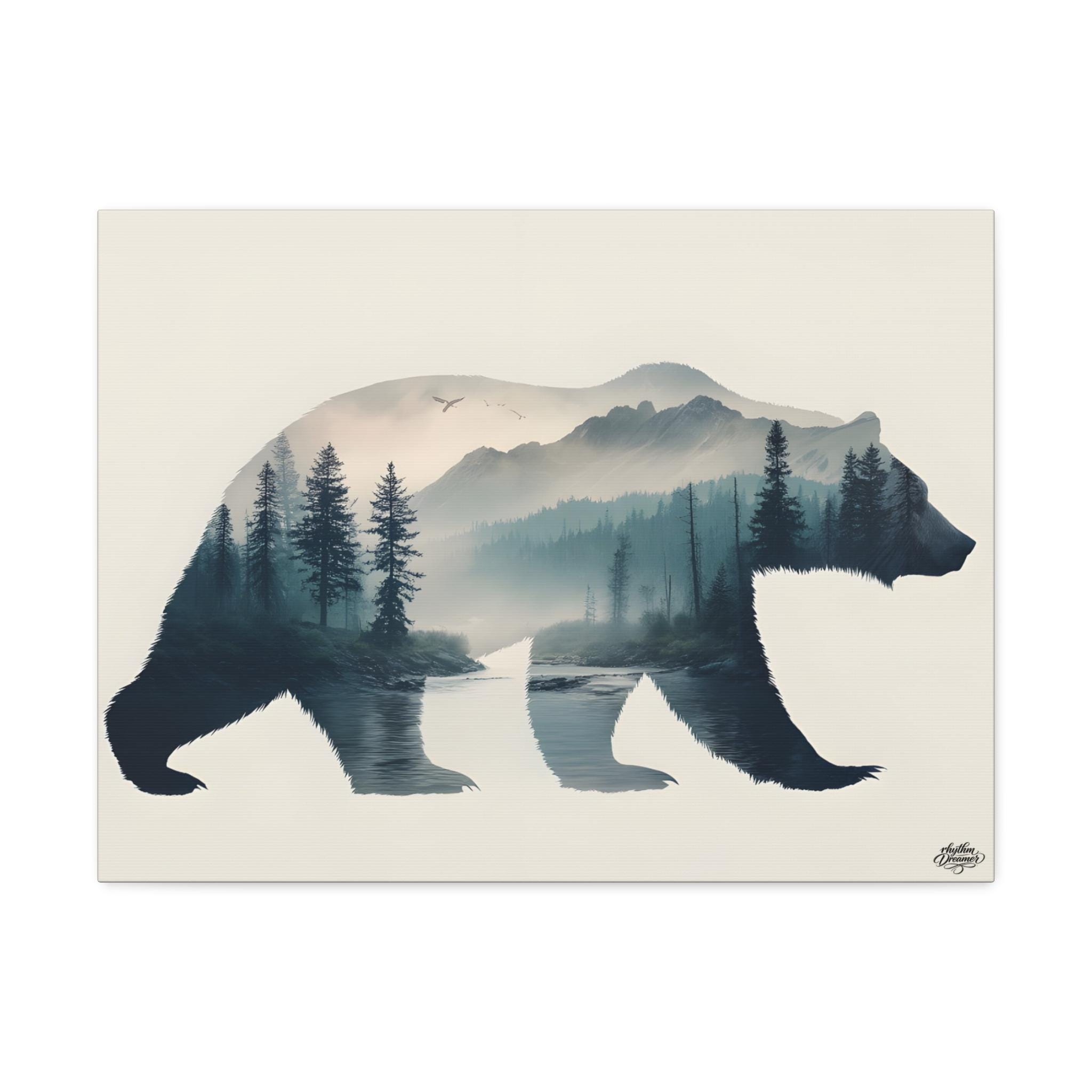 Bear silhouette with mountain, forest and river – Minimalist nature wall art | Wild wall decor 45 cm × 61 cm